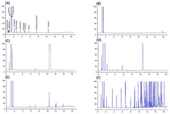 Chromatograms standard mix (A), USP-grade ethanol (B), compliant (Health Canada guideline) liquid ABHR (C), non-compliant (Health Canada guideline) liquid ABHR (D), compliant (Health Canada guideline) gelled ABHR (E), and non-compliant (Health Canada guideline) gelled ABHR (F).