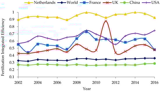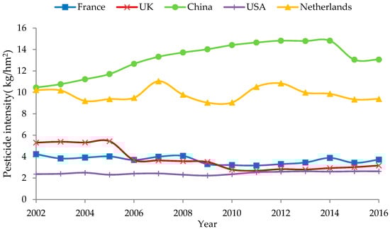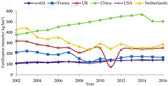36] to data provided by the Food and Agriculture Organisation of the United Nations on fertiliser application and grain production in each country from 2002 to 2016. We conducted a comparative study of the intensity and efficiency of fertiliser and pesticide application in China and the UK, France, the US, and the Netherlands to explore not only the changing patterns of fertiliser and land-use efficiency in China and major European and American countries but also the problems of fertiliser and pesticide application in China [