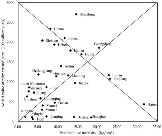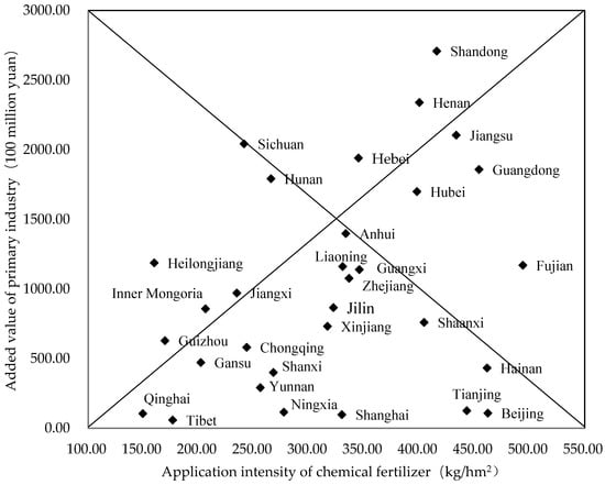 The results of the factor decomposition analysis reveal that the value added of the primary industry has the most significant impact on fertiliser and pesticide use. To understand the characteristics of the relationship between the intensity of fertiliser and pesticide application and crop yield in each province, this paper presents the intensity of fertiliser and pesticide use and the value added of primary industry in each province in recent years. First, the 31 provinces have been classified into the following four categories: high-intensity, high-yield (HS–HY); high-intensity, low-yield (HS–LY); low-intensity, high-yield (LS–HY); and low-intensity, low-yield (LS–LY), using the intensity of pesticide use as the intensity indicator and the value added of primary industry as the yield indicator.