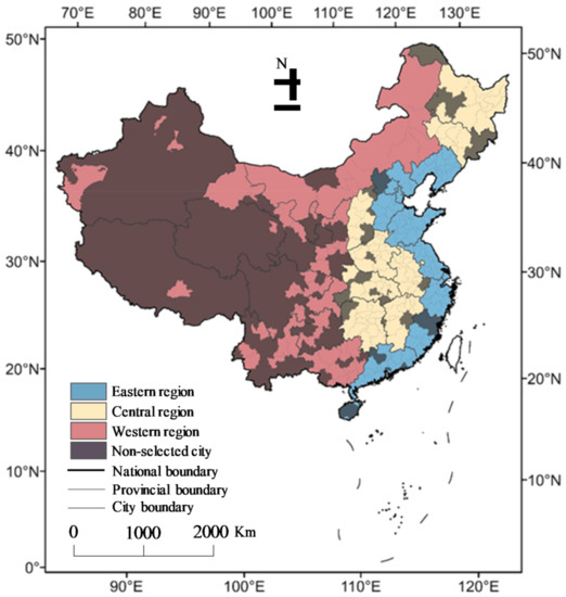 The urbanization process in China revealed significant regional differences, as the urban development speed in the eastern regions (ER) was higher than that in the central (CR) and western regions (WR) as shown in (Figure 3 and Figure 4), and the PM2.5 concentration showed spatial variations (Figure 5). This led to the following questions in this study: Is there a regional difference in the impact of the UF on the PM2.5 concentration? To answer this question, this study separated the ER, CR, and WR of China with the division method prescribed by the National Bureau of Statistics. This study then estimated the relationships between the UF and PM2.5 concentration across the ER, CR and WR at the provincial and city scales.