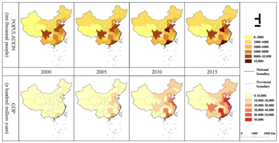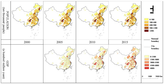 The population and gross domestic product (GDP) were adopted as control variables. We collected urban population and GDP data from the China Statistical Yearbook, which shares the same time range as that of the PM2.5 and UF data, according to the administrative divisions (Figure 3 and Figure 4). These factors could influence both the PM2.5 concentration and UF. The urban population size was chosen as a control variable because it has been demonstrated to contribute to the PM2.5 concentration in China, exhibiting an inverse U-type relationship [31]. Additionally, local economic growth is another driving force impacting the PM2.5 concentration [32]. Shi, et al. [33] found that over the 15 years between 2000 and 2015, the speed and scale of urban space expansion in China far exceeded those of urban economic expansion. Only by controlling all the variables other than the independent variables triggering variations in the dependent variable can the cause-and-effect relationship be clarified in experiments, so adding these two variables was vital to facilitate the exploration of the relationships.