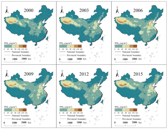 Spatial distribution of the fine particulate matter (PM2.5) concentration from 2000 to 2015.