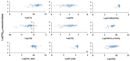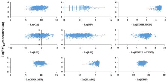 Table 5 lists panel data coefficients calculated at the different scales and with the various models. As indicated by the table, the indicators noticeably correlated with the PM2.5 concentration accounted for the majority of the indicators. In order to show their relationships more clearly, Figure 6 and Figure 7 illustrate the scatterplots of the metrics and PM2.5 concentration.