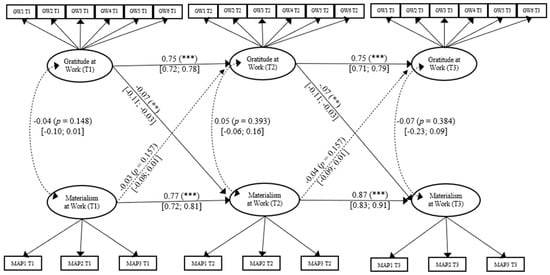 Third, and finally, aiming for a more parsimonious model as well as to gain statistical power, we constrained all paths to be invariant over time []. This final model showed good fit, χ2 (304) = 141,082, p < 0.001, CFI = 0.91, SRMR = 0.074, RMSEA = 0.044 (90% CI: [0.042, 0.047]). Additionally, this model showed no significant differences compared with the previous model, Δ χ2 (4) = 7.47, p = 0.11. Factor loadings ranged from 0.33 to 0.89 (all p < 0.001). Supporting H1, gratitude at work was a significant negative predictor of materialism at work at the between-person level, β = −0.07, (95% CI. [−0.11, −0.03]), p = 0.001. However, H3 was not supported. Materialism at work did not predict gratitude at work, β = −0.03, (95% CI [−0.08, 0.01]), p = 0.16. No other significant paths were found (Because we constrained the paths from T1 to T2 to be equal to the paths from T2 to T3, for simplicity, we report here only the former. Our figures show all the details). The structural parameters are presented in Figure 1.