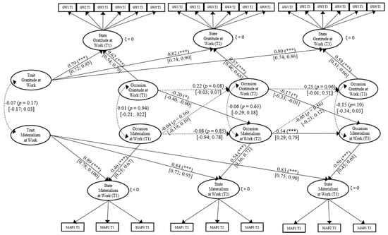 To complement the results obtained in CLMP model, we conducted a TSO, following Unanue, Martela, Vignoles, and Dittmar []. This methodology allows us to partition a latent variable (State) into two constructs, a completely stable latent variable (trait) and another latent variable that varies over time (occasion) [,,]. This process allows us to estimate the within-person changes. First, we started modelling the state variables of gratitude at work and materialism at work as latent variables with factor loadings to each observed variable freely estimated auto-correlated uniquenesses for each observed indicator over time. Second, separate the state variance into a latent variable trait and occasion. Third, the latent variables of trait were loaded to the three state variables in their corresponding time with a fixed load of 1. Fourth, the occasion latent variables were loaded into the state variables in their respective time with a fixed load of 1. Fifth the residual variance of the state variables was set to zero. Sixth, covariances were estimated freely among the occasion variables within each time-point and among the trait variables. Seventh, we tested our hypothesis by modelling cross-lagged paths among the occasion variables following the recommendations of LaGrange et al. [] that is to say each measure of occasion gratitude at work and materialism at work at (T+1) was regressed on its own lagged measure at (T) as well as on the other lagged measure at (T), Thus, all constructs were represented as potential antecedents and potential consequences of the other construct, while controlling trait-level relationships and stability across occasions.