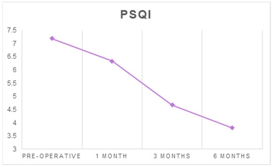 The mean PSQI score decreased from 7.19 ± 3.91 before surgery to 3.81 ± 3.32 at six months after surgery (p < 0.001) (Table 1 and Table 2, Figure 1).
