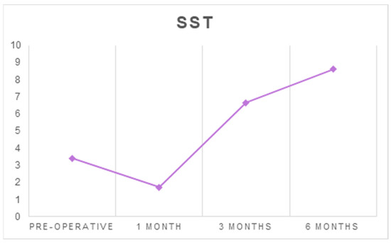 The mean SST score increased from 3.41 ± 2.73 before surgery to 8.62 ± 2.65 at six months after surgery (p < 0.001) (Table 1 and Table 2, Figure 3).