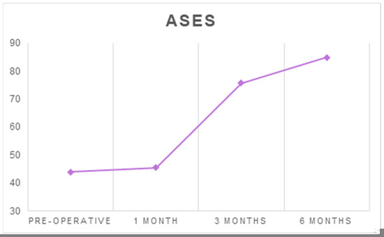 The mean ASES increased from 43.94 ± 20.4 before surgery to 84.95 ± 13.27 at six months after surgery (p < 0.001) (Table 1 and Table 2, Figure 4).
