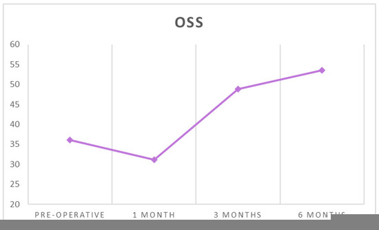 The mean OSS increased from 36.09 ± 10.96 before surgery to 53.60 ± 5.79 at six months after surgery (p < 0.001) (Table 1 and Table 2, Figure 5).