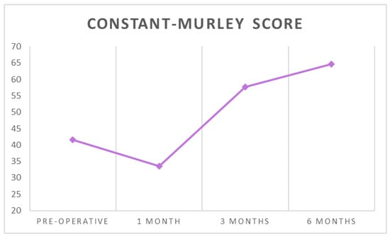 The mean Constant score increased from 41.6 ± 15.58 before surgery to 64.59 ± 9.85 at six months after surgery (p < 0.001) (Table 1 and Table 2, Figure 6).