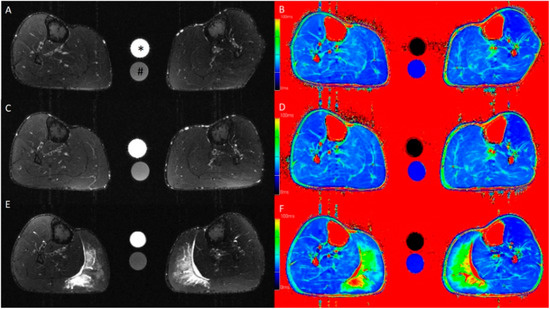 Axial T2-weighted turbo inversion recovery magnitude (A,C,E) and axial T2 mapping (B,D,F) images of the lower leg at baseline (A,B) and at 6 h (C,D) and 48 h (E,F) after standardized exercise of the calf muscles. Muscle edema is apparent in the medial gastrocnemius muscle in the post-exercise images after 48 h. This participant wore the compression garment on the left calf for 6 h after exercise. The calibration tubes contain 40 mmol/L NaCl (*) and 40 mmol/L NaCl with 5% agarose (#).