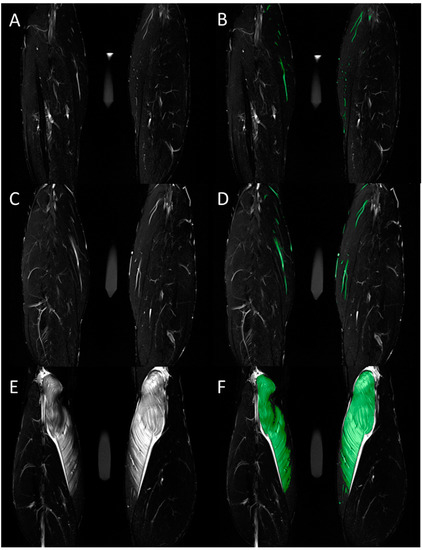 Total volume of intramuscular edema was assessed in the coronal T2-weighted TIRM images. Representative images before (A,C,E) and after (B,D,F) color-coded manual segmentation of the edematous medial gastrocnemius muscle are shown for measurements at baseline (A,B) and at 6 h (C,D) and 48 h (E,F) after standardized exercise. Hyperintense vessels were segmented in the baseline images and subtracted from the segmented volume in the post-exercise images.
