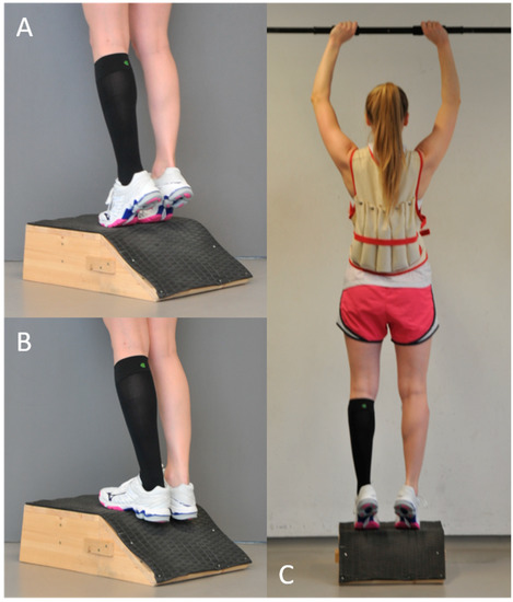 Exercise intervention: All volunteers performed an established standardized training that included plyometric and eccentric exercises of both lower legs while wearing a compression garment on a randomly selected calf (left or right side). All exercises were monitored by an experienced strength and conditioning coach. Each participant warmed up using two sets of heel raises (15 repetitions per set), with a 20 s break between sets. Immediately after the warm-up, the plyometric exercise was performed. Volunteers completed 5 sets of 10 repetitions each of drop jumps from a 0.25 m box (5 s between jumps and 1 min between sets). Volunteers were asked to hop off from the box with both feet, land with both feet together, and perform a maximal vertical jump with the shortest possible contact time to the ground. After a 2 min break, a previously described eccentric exercise was performed on a specifically manufactured slant plate (−35°) [17,18]. To increase the load, each volunteer wore a weighted vest bearing approximately 40% of his/her body weight during the entire eccentric exercise (Figure 3). All participants performed 5 sets of 50 repetitions each and rested 60 s between sets, with the last set being performed until muscle fatigue, so that no further repetition of eccentric exercise was possible.