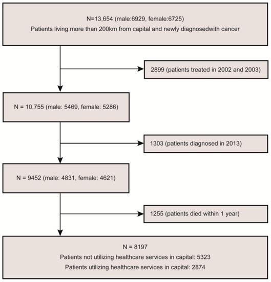 The study population comprised patients living more than 200 km from the capital and those newly diagnosed with cancer (C code) according to the International Classification of Diseases 10th revision (ICD-10) during a nine-year period (2004–2012). Patients (n = 2899) treated for cancer in 2002 and 2003 were excluded in the analysis. Patients with cancer (n = 1303) newly diagnosed in 2013 were likewise excluded from the analyses. Patients (n = 1255) who died within one year of the cancer diagnosis were also excluded from the analyses. This study is designed for patients who were observed for at least one year. No information exists on the cancer stage in the data. The cancer stage is a decisive factor that influences death. Patients with more advanced cancer stages are more likely to seek care in the capital’s major hospitals. As such, patients who died within one year of diagnosis were excluded. Thus, the final sample included 8197 patients with cancer (Figure 1): 3939 males (48.1%) and 4258 females (51.9%). The average follow-up period was 4.7 years (range: 1–10, median: 4.1).