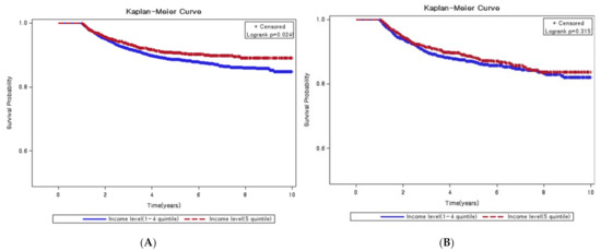 Kaplan–Meier curve of cancer patients for ten years according to income level by utilization in the capital. (A) Patients not utilized in the capital; (B) Patients utilized in the capital.