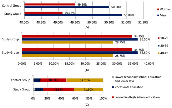 We enrolled a total of 1200 participants, 800 in the study group and 400 in control. More than 50% of respondents were men in both groups, while women constituted 49.13% and 49.50% surveyed (Figure 1A). Both in the control and the study group, individuals between 30 and 39 were the majority (36.5%) (Figure 1B). The study group was dominated by patients with secondary education, representing 44.38% of the total population. On the other hand, there were more respondents with higher education in the control group 52.25% (Figure 1C).