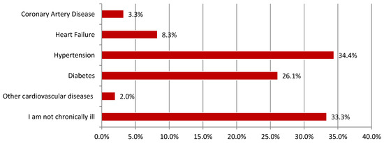 Arterial hypertension was the most commonly declared chronic disease. This answer was provided by almost one in every three individuals (34.42%). Coronary artery disease, heart failure, and other diseases affected fewer patients (3.25%, 8.25%, and 2.00%, respectively). A detailed distribution of responses has been summarized in Figure 2. The respondents who declared that they were not suffering from a chronic disease should be understood as the control group (33.33%).