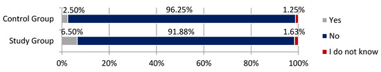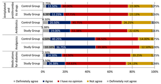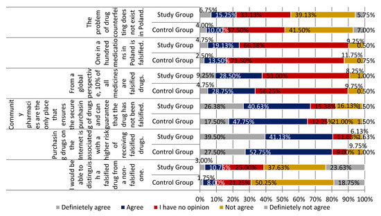 Few individuals agreed with the statement that the problem of drug counterfeiting does not exist in Poland, with a slightly higher percentage of positive answers identified among respondents from the study group (22.00% vs. 14.00% from the control group). The difference in the distributions of responses in each group was statistically significant (p < 0.05). The vast majority of participants agreed that community pharmacies are the only place that ensures the secure purchasing of drugs and guarantees that the drug has not been falsified (67.01% study group and 65.25% control group; p < 0.01). The majority of respondents were convinced that purchasing drugs on the Internet is associated with a higher risk of receiving falsified drugs. More than 80% of the respondents agreed with this statement 80.63% of respondents from the study group and 80.25% of the control group respondents (definitely yes, somewhat yes). The difference in the distributions of responses in each group was statistically significant (p < 0.001). More than half of the participants claimed that they could not distinguish a falsified drug from a non-falsified one. There were slightly more respondents who felt this way in the control group than in the study group (69.00% and 61.26%; p < 0.01). Participants agreed that falsified drugs can worsen the health status (86.88% of respondents in the study group and 83.25% in the control group). The vast majority of respondents did not agree with the statement that a falsified drug is as safe as a non-falsified drug (study group 75.76% and control group 82.30%; p < 0.001). All the above-mentioned main findings are summarized in Figure 5, Figure 6 and Figure 7.