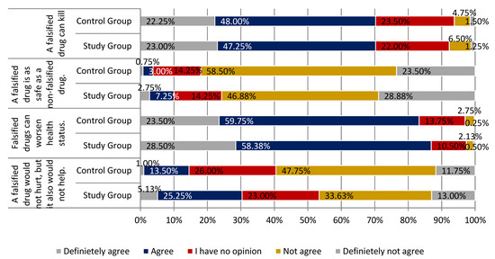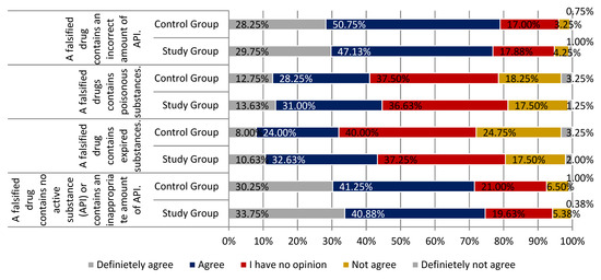 In both the study and the control groups, participants mostly agreed with the statement that a falsified drug does not contain any active pharmaceutical ingredient or contains the incorrect amount of API (respectively, 74.63% and 71.50%). Both groups replied similarly to the statement that falsified drugs have poisonous substances, with less than half of the study group’s respondents, and those in control assessing this statement as pertinent (respectively, 43.63% and 41.00% of respondents). According to an overwhelming majority of respondents, both in the study and the control group, falsified medicines contain the wrong amount of API, which is correct (76.88% and 79.00%, respectively).