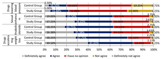 Respondents from both groups agreed with the statement that the most commonly falsified drugs are those accelerating weight loss. A larger percentage of people convinced this statement is true was observed in the study group (respectively, 81.13% of respondents in the study group and 76.00% in the control group; p < 0.01). Compared to the previous statement, a slightly smaller number of respondents considered anabolic steroids as the most common drugs that are falsified (respectively, 61.76% and 63.00% of responses; p < 0.01). In the case of drug potency, the distribution of responses was similar to that achieved in the context of anabolic steroids. Sexual enhancers were believed to be the most commonly falsified drugs. A small group of respondents agreed with the statement that antiplatelet and antithrombotic drugs are the most commonly falsified drugs (18.63% of respondents from the study group and 16.25% of the respondents from the control group). Every fourth respondent did not consider this sentence correct (23.63% and 23.75% of respondents). This part of the questionnaire is summarized in Figure 8 and Figure 9 (parts 1 and 2).