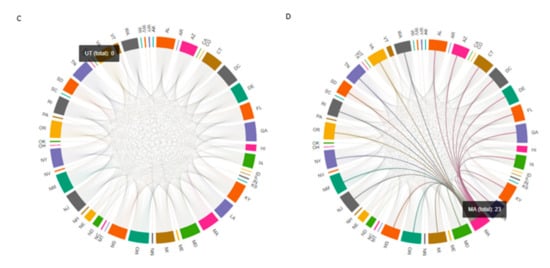 The COVID-19 correlation network for all US states (A), Arizona (B), Utah (C), and Massachusetts (D) (Please refer to https://github.com/RezaDavahli/Graph_neural_networks for live figure; accessed on 10 March 2021).