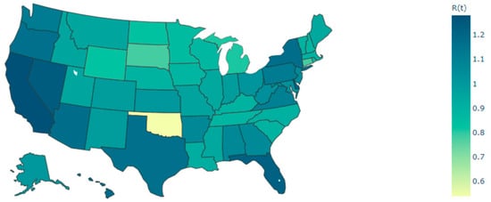 GTNN and NGNN models were used to predict values for Rt in all states of the US. The number of confirmed COVID-19 cases from 22 January to 26 November 2020, was extracted from the CDC website. The Excel file of the EpiEstim package was borrowed from Cori et al. [4] to calculate Rt. For example, Rt for all states of the US on 26 November 2020, is shown in Figure 3.