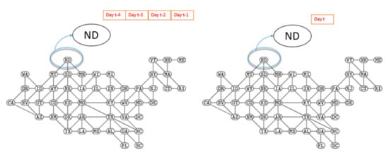 The performance of these models was evaluated with the datasets that included Rt values reflecting conditions from 22 January through 26 November 2020. In both of these models, the individual states were identified by nodes. For the NGNN model, the edges were connections between neighboring states; for the GTNN model, the edges represented functional connectivity. Node features include Rt of time steps; no specific edge features were identified. For the training and testing datasets, we used Rt values for each state calculated for the previous four days (i.e., node features) to train and predict the value Rt for each state on the day to follow (one day sliding window). This is shown for the NGNN model in Figure 5. It should be mentioned that we tried different time window and we reached a conclusion that training based on the previous four days provided the the best results. The datasets were divided into training and testing datasets. We used 98% of data for training (including a randomly-selected 75% for training and 23% for validation) and 2% for testing (data for seven days for testing from 20 November 2020 to 26 November 2020 was applied). The number of days selected for the testing period was adopted from Zheng et al. [8] in order to provide improved comparability of our results.