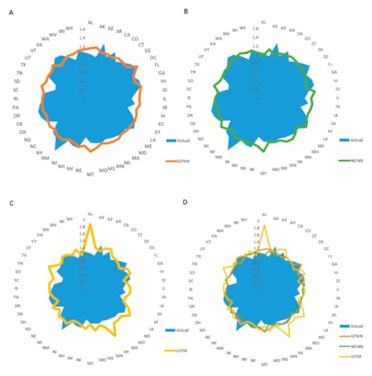 We also represented the forecasting performance of the GTNN, NGNN, and LSTM models for all US states on 23 November 2020 (Figure 7). As shown, both GTNN and NGNN outperformed the baseline LSTM model.