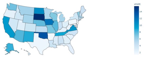 This study’s final limitation is related to the efficiency of developed models for different US states. As shown in Figure 8, the displayed average sMAPE values represent the differences between our model’s forecast and actual values for the seven days of the testing period. Because developed models trained based on previous days, it is possible that for a different testing period, the outcome measure would be different for states of the US.