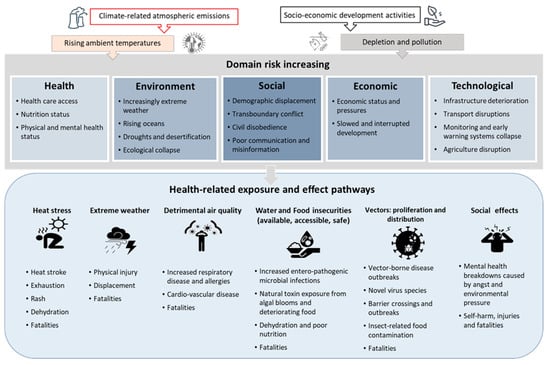 Examples of major health risks associated with climate and environmental change. This Figure 1 is developed from insights from [3,5,17] and is not intended to be comprehensive.