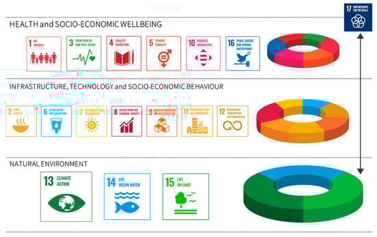 A Sustainable Development Goals approach to harmonizing the natural environment with anthropogenic structures (reflected in infrastructure, technology and socio-economic behaviour) to support health and wellbeing. This Figure 2 is developed from insights from [21,24] and is not intended to be comprehensive.