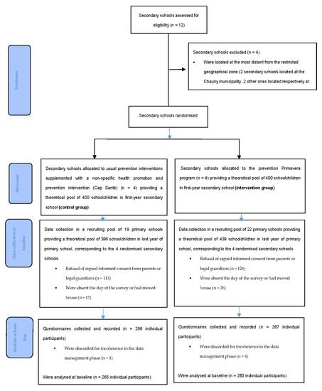 The randomization unit was conducted during secondary school. Randomization of the school classes or schoolchildren was not used in order to limit a potential bias of interindividual influence. Indeed, as the Primavera prevention programme aimed to have a direct impact on the schoolchildren’s educational environment (class, school, and home), random allocation between intervention and control groups applied to schoolchildren from the same classroom or the same school would have created biased assessment conditions (the intervention would have had an impact on the control group). Clustered randomization is often used in this type of assessment for similar reasons [19,23,24,25,26]. To have a sufficiently large pool of participants, a sample of twelve secondary state schools from the Amiens academy was constituted over a restricted geographical zone. The sample was composed of schools in a geographical area within a 30 km radius of the prevention programme centre (Saint-Quentin, France). Among them, the four schools most distant from the restricted geographical zone were excluded, to optimize commuting for the prevention programme organizers. In all, eight secondary schools were randomized, providing a theoretical pool of 826 schoolchildren in first-year secondary school, corresponding to a recruiting pool of 41 primary schools. Randomization was carried out using the randomized block method. Two blocks of four secondary schools were computer generated. Allocation was 1:1. Figure 1 shows a flow chart of the recruitment process for the schools and the participants.