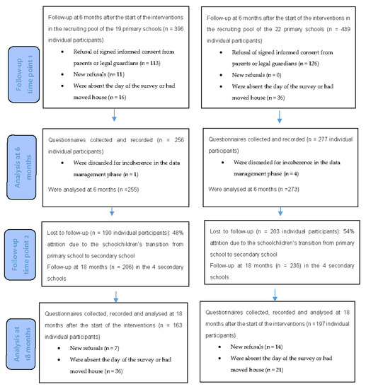Comparisons were carried out separately at inclusion (baseline), at 6 months from the start of the interventions (follow-up time point 1), and at 18 months (follow-up time point 2). As follow-up time point 3 could not be completed because of the SARS-COV2 pandemic, the comparison that was initially planned at the end of the prevention programme at 30 months from its launch could not take place.