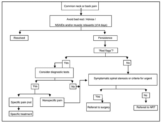 Indication criteria for NRT, are: neck, back pain, or referred pain ≥ 3 points on a 10-point visual analog scale (VAS) []; lasting ≥ 14 days; and not caused by systemic diseases, direct trauma or fracture. NRT is not indicated if the patient is allergic to metal, presents cauda equina syndrome, or suffers from neurogenic claudication caused by lumbar spinal stenosis [,,,,,,,,,,,]. Patients with failed back surgery can be treated. Patients with “red flags” can only be treated once the appropriate tests have ruled out that pain is caused by systemic conditions such as spondylitis, neoplastic, infectious, vascular, metabolic, visceral or endocrine-related processes [,,,,,,,,,,,,].