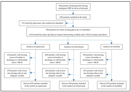 Data analyzed in this study stem from surveillance mechanisms in routine practice. These mechanisms encompass all patients who undergo NRT within the Spanish National Health Service, with very little losses to follow-up, and use previously validated methods [,,,,,]. Therefore, validity of data is not a major concern. However, this study has several weaknesses. It was impossible to distinguish the results obtained by the trainees during their training period from those obtained by the senior experts who acted as their supervisors. In the future, trainees will be assigned a personal code throughout their entire traineeship period, which will make it possible to analyze the results they obtain separately. Missing data impeded inclusion of data from all patients in the full models on spinal pain, referred pain, and disability (Figure 2). However, it is unlikely that missing data introduced any biases, since the proportion of patients who improved and did not improve were virtually the same in the empty and full models (Table 9). The number of years of solo practice after certification and the number of patients treated by each physician were skewed; this may influence the stability of results from the models. This is due to the fact that, in order to comply with the training standards, new trainees are only recruited when the procedure is implemented in a new territory. Generalizing this procedure will make it possible to resolve this.