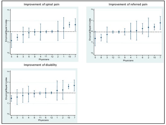 Conceptually, MOR reflects the degree of variability in clinical results which stem from the fact that the patients are treated by different physicians. A higher MOR reflects a higher variability. The MOR quantifies the difference in results obtained by different physicians, by comparing clinical results from two patients treated by two different physicians selected randomly. For instance, considering two patients with the same covariates, selected randomly among cases treated by two different physicians, the MOR is the median odds ratio between the patient with higher odds and the patient with lower odds [], and can be interpreted as the median increased odds of improvement, if a given patient was treated by another better performing physician. A MOR value of 3 would mean that the median odds of a patient improving if treated by the physicians obtaining the best results is 3 times higher than the odds for improving if treated by the physicians obtaining the worst results. In this study, the MOR shows the extent to which the probability that an individual patient will improve (in terms of pain severity and disability) is determined by the treating physician [].