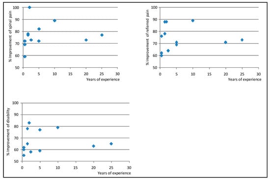 Years of experience for each physician, and improvement in neck and back pain, referred pain, and disability *. *: Note that the figure shows improvement in pain and disability between 50% and 100% of baseline values (not between 0 and 100%). Therefore, differences across physicians appear to be larger than they are.