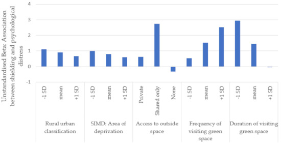 Duration of visiting green space did not moderate the effects of age and gender but did moderate the effect of shielding category (Table 2 and Figure 1). The follow-up simple slope analysis demonstrated that the association between receiving a letter/text about shielding and greater psychological distress was more pronounced in people who visited green space for shorter durations. In the group of people who visited green space for longer durations (1 SD above the mean), people who had received a letter/text about shielding no longer differed in psychological distress from those who had not received a letter/text about shielding.