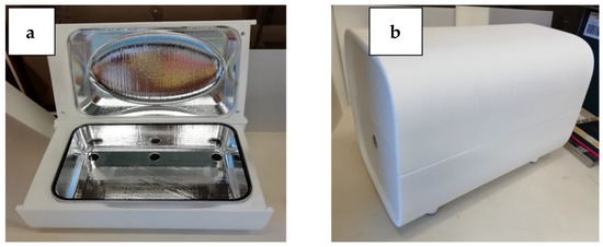 (a) Base and lid of the white disinfection box; UV chips are visible in the bottom part. (b) Box with the lid closed.