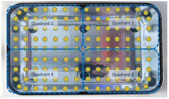 The direct irradiance from the chips was evaluated at 126 points positioned at the level of the internal quartz plane (in yellow, Figure 2). To properly measure the irradiance at these points, we created a 3D-printed mask (in blue, Figure 2), using a high-resolution printer (Form 2 Formalb), which was a quarter of the size of the crystal plane. On the mask, 35 holes of the exact size of the probe with the cosine corrector were positioned to improve the precision of the measurements and to standardize the measurements and positioning. Moving the mask into the 4 different quadrants of the box, it was possible to collect the 126 measurements.