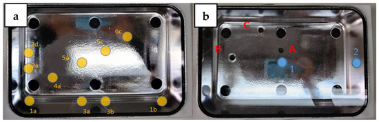 On the left (a), a representation of 10 points (in yellow) where the cosine corrector was inserted to measure irradiance. On the right (b), 3 holes (in red) drilled into the bottom of the box, and the two positions (in blue) selected to perform the tests.