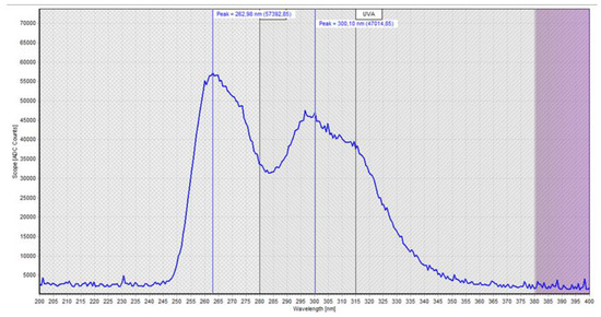 The measurements of the UV light spectrum of the chips are shown in Figure 4 and, as already explained in the first part of this study, it is possible to observe a relatively broad spectrum with a peak at 265 nm (UVC) and a secondary (lower) peak at approximately 300 nm (UVB) that extends to approximately 350 nm (UVA) (Figure 4).
