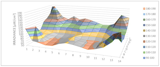 Figure 5 shows the direct irradiance measured and modeled using the 126 sampling sites. The zones with the higher value of irradiance (max. 187.9 µW/cm2) were those near the corners of the box, while the lowest irradiances were measured (min. 61.9 µW/cm2) near to one of the long sides of the box. The center of the crystal was the part that had lower values than the corners. The light distribution was almost symmetrical with respect to the center of the system.