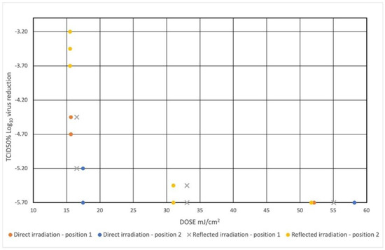 Figure 6. Dispersion plot shows the virus concentration reduction based on the irradiation dose to which it was exposed. The value of Log TCID50% = 1.50 means total viral inactivation—limit of detection. The initial concentration of viral suspension of SARS-CoV-2 was 107.2 TCID50%.