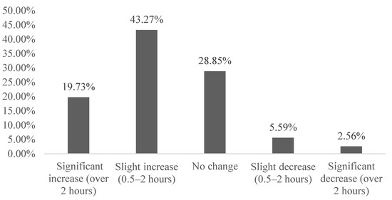 Man is the active factor of the relationship between humanity and the land, and it is also the core element affecting socio–economic geography [30]. This is especially true when entering the era of intelligent information and ecological civilization in the 21st century, wherein personal moral belief, mode of thinking and spiritual pursuit are the endogenous driving forces for familial harmony. According to the results of the survey, the mean value of family relationship interaction among different groups ranged from 2.201 to 2.507 (see Table 2). Compared with the threshold of “1–5” (corresponding to “significant increase—significant decrease”), the overall communication and interaction among family members generally increased, but the change in family relationship was not drastic and the gap among different groups was not significant, which essentially amounted to no difference. This shows that the impact of public health emergencies on all families is the same, regardless of the individual’s occupation, age, education level and family scale. The most important thing for the family relationship is the time spent together, and the companionship of the family members is fundamental to family harmony and stability. It is noteworthy that the impact of public health events is sudden and the time node is very strong, which is different from the findings of a long-term in-depth investigation and interview from the society or psychology perspective [31,32,33]. The changes in family relationships caused by this may also be abrupt, rather than the subtle influence of family members over multiple years.