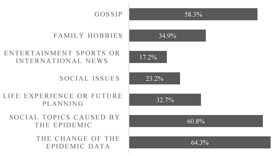 In the closed or semiclosed home environment, family members are more inclined to talk about hot issues related to the epidemic situation. The proportion of the group whose main communication content is the change in epidemic data was measured up to 64.3% of the total, and the percentage of groups that discussed the social topics caused by the epidemic was as high as 60.8% of the total. In terms of being affected by the epidemic and the closed lifestyle, on the one hand, a large proportion of people who have been idle at home for a long time chat and kill time, which accounted for 58.3% of respondents; on the other hand, there has been an increase in emotional communication among families living together, with nearly a third of respondents sharing life experiences, future plans and hobbies with their family members. In terms of the degree of communication between family members, the largest proportion of respondents with superficial communication accounted for 42.6% of the total, while 29.1% of respondents had in-depth communication with their families to exchange ideas and 28.2% of respondents said that they could not judge the degree of communication. To the contrary, only a small proportion of respondents were concerned with entertainment or international news events, only accounting for 17.2% of the total (see Figure 2).