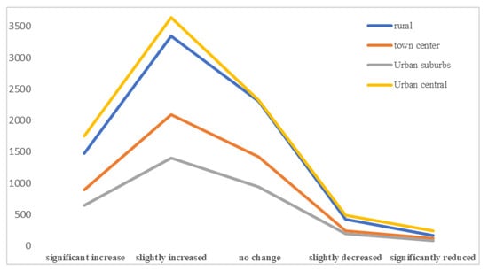 In terms of urban and rural settlements, due to the long-term urban–rural dual system in China and the uneven development policies of urban and rural areas, as well as the different natural landscapes and cultural backgrounds present, correspondingly different economic pattern and life philosophies have been formed [34], which may lead to cognitive biases and regional differences in family relations between urban and rural residents. Whether in urban or rural areas, the survey reflects that most of the respondents have improved their family relationships under the epidemic, while few family relationships have become worse, as shown in Figure 6.