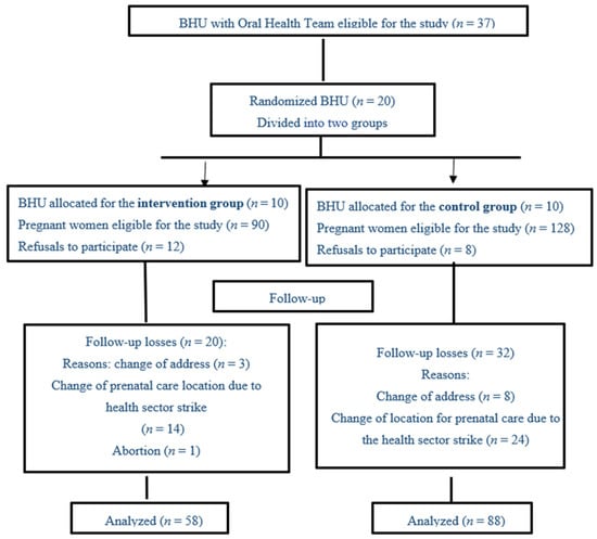 For the sample calculation, the following parameters were used: 95% confidence interval, frequency of oral diseases in pregnant women of 21% [], difference of 40% in the frequency of these diseases between the groups after the intervention and a sampling power of 80%. The sample size of pregnant women eligible to participate in the study was 198, divided into two groups. However, the final analysis was performed with 146 pregnant women, with 58 belonging to the intervention group (IG), considering the protocol’s inclusion criteria, and 88 pregnant women for the control group (CG); the losses and reasons are exposed in the flowchart (Figure 1).