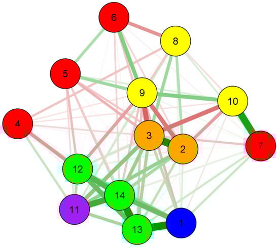 Network perspective of the association between sociodemographic and behavioral factors, group (intervention and control) and mother–child oral health. 1: Group; 2: Initial oral health risk; 3: Final oral health risk; 4: Age; 5: Educational level; 6: Income; 7: Home water; 8: Oral hygiene; 9: Smoking; 10: Alcohol; 11: Maternal complications; 12: Birth weight; 13: Baby’s complications at birth; 14: Prematurity.