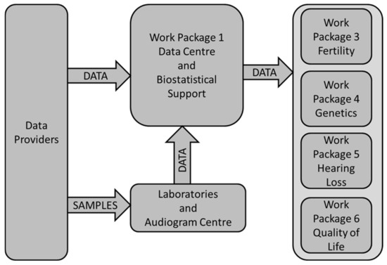 The work package WP1 (Data Centre and Biostatistical Support; P. Kaatsch) was responsible for data management. Its central role is shown in Figure 1: data providers sent data directly to the data center according to variable lists provided by the scientific WPs. Samples (saliva or blood) and audiograms were sent to the laboratories and audiological reference center, respectively. Data generated at these places were additionally sent to the WP1’s central data base. WP1 performed data harmonization (e.g., clarification of uncertainties with data providers arising from plausibility checks); linked the relevant demographic, clinical, genetic, and audiological data; and finally sent plausibility checked data to the scientific WPs for analysis. To consider data protection rules all data were sent in pseudo-anonymized formats.